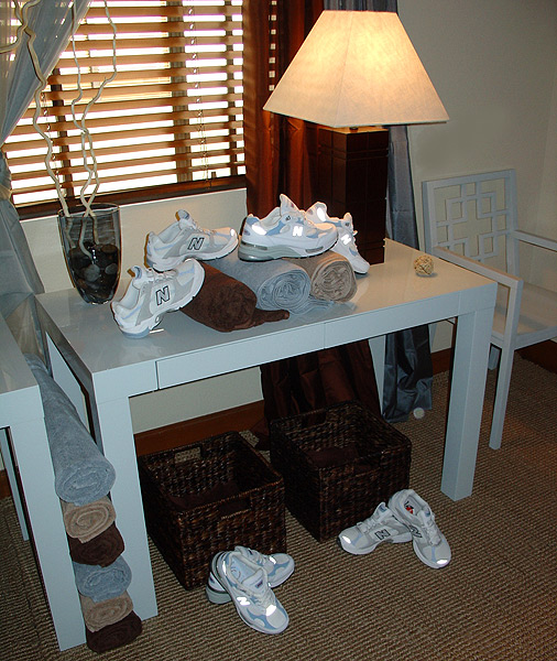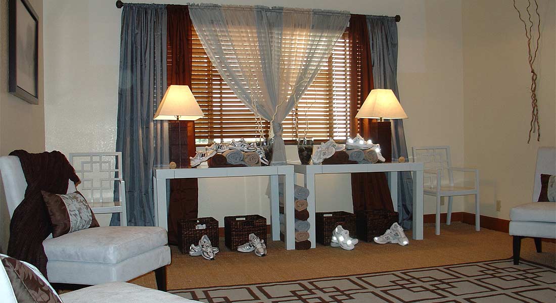 I was asked to redesign a room at Miraval Spa for New Balance. The room was to be featured on The Oprah Winfrey Show as part of her summer revival series.The purpose was to help women who had gone through troubled times get fitted for athletic wear, inspiring them "on a road to healing". I was given less than a week to find, buy, deliver, and transform a meeting room into The New Balance Women’s Salon.